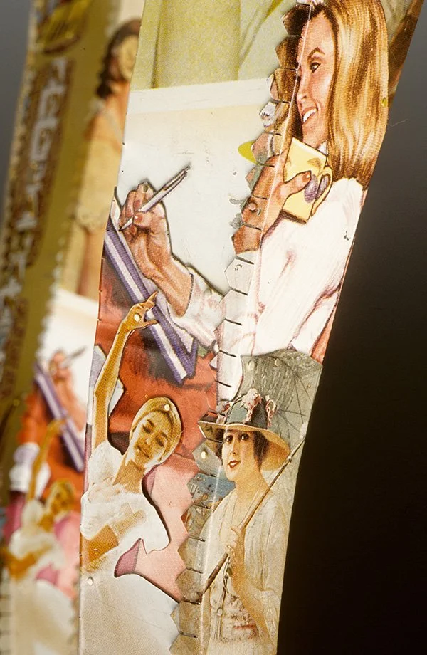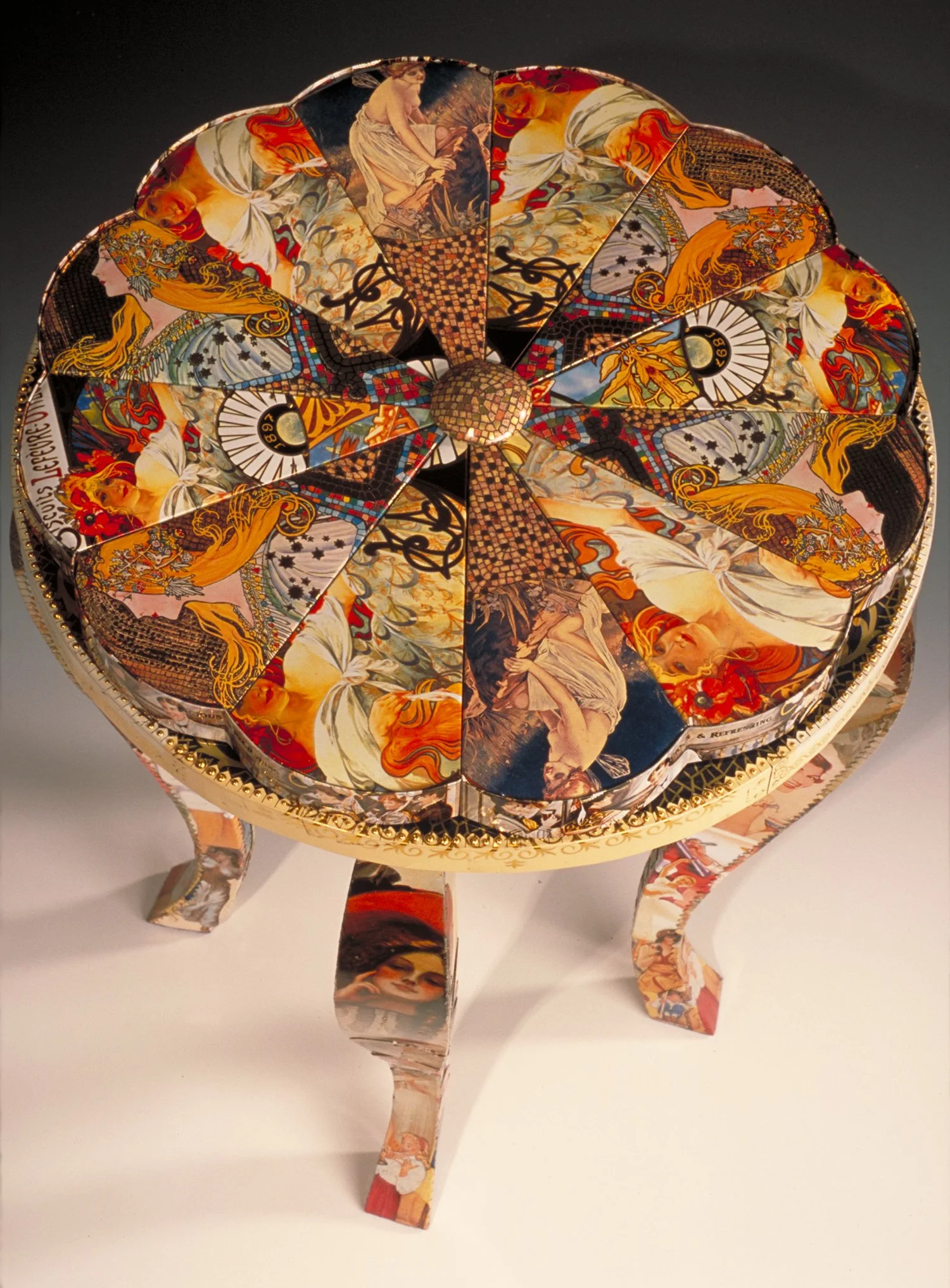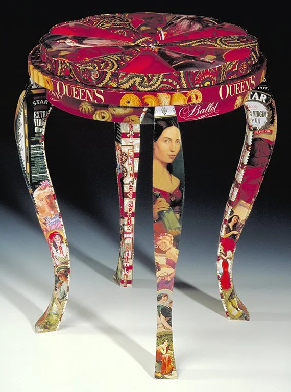 Look closely at the image below. The vanity seat cushion is constructed as if it were made from fabric, but it is all metal, recycled tin cans. Even the button in the center is tin cans. Each section of the cushion is another image of a woman and stereotypical standards of beauty.
