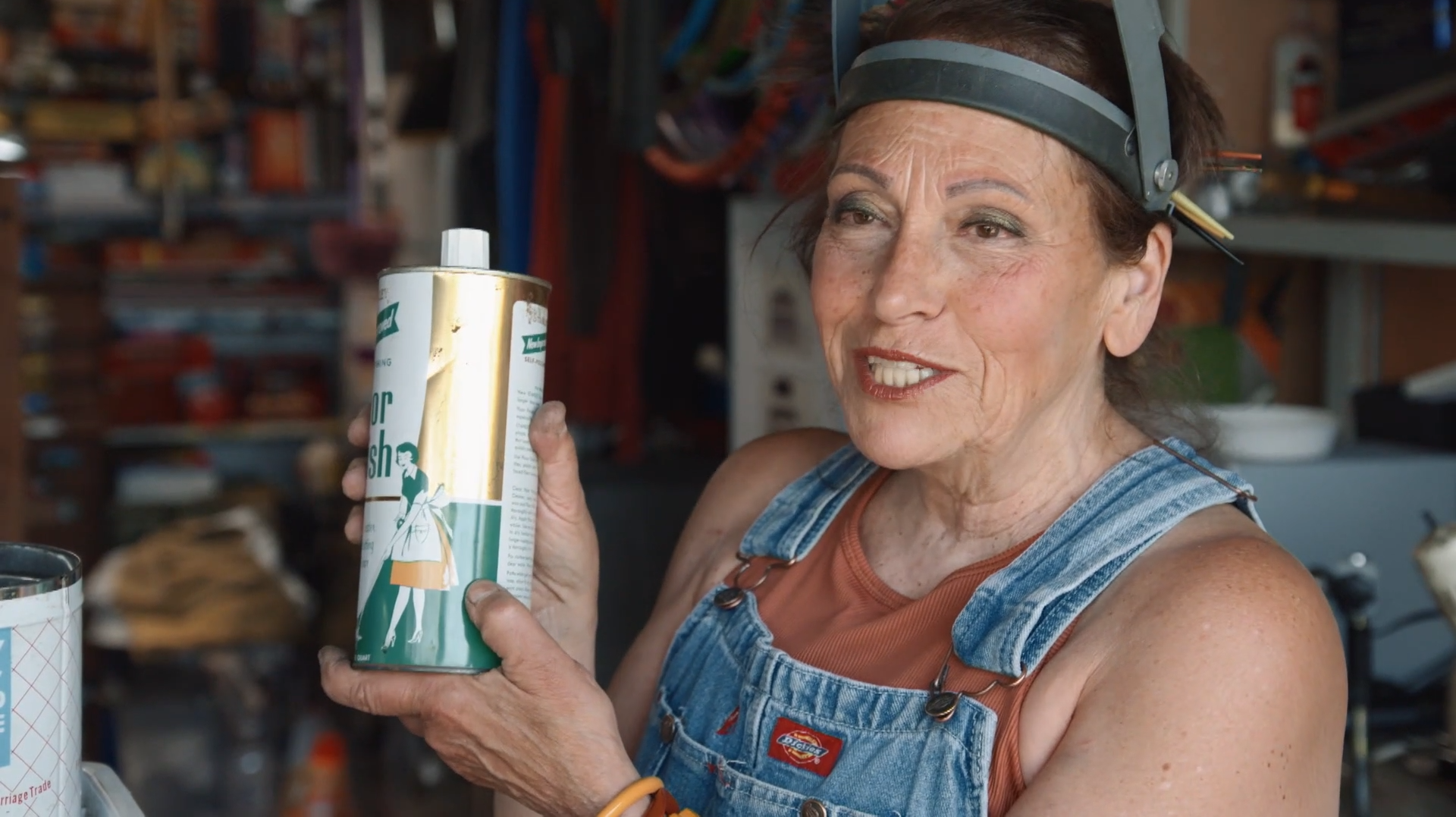 The next image below is a screen grab from the JEWELRY episode from Craft In America. This mid-20th tin can for floor wax includes a woman cleaning house in her perfectly clean and pressed house dress. The image suggests that house cleaning is fun, easy and slightly glamourous (which is also suggested by the metallic gold finish on the can.)