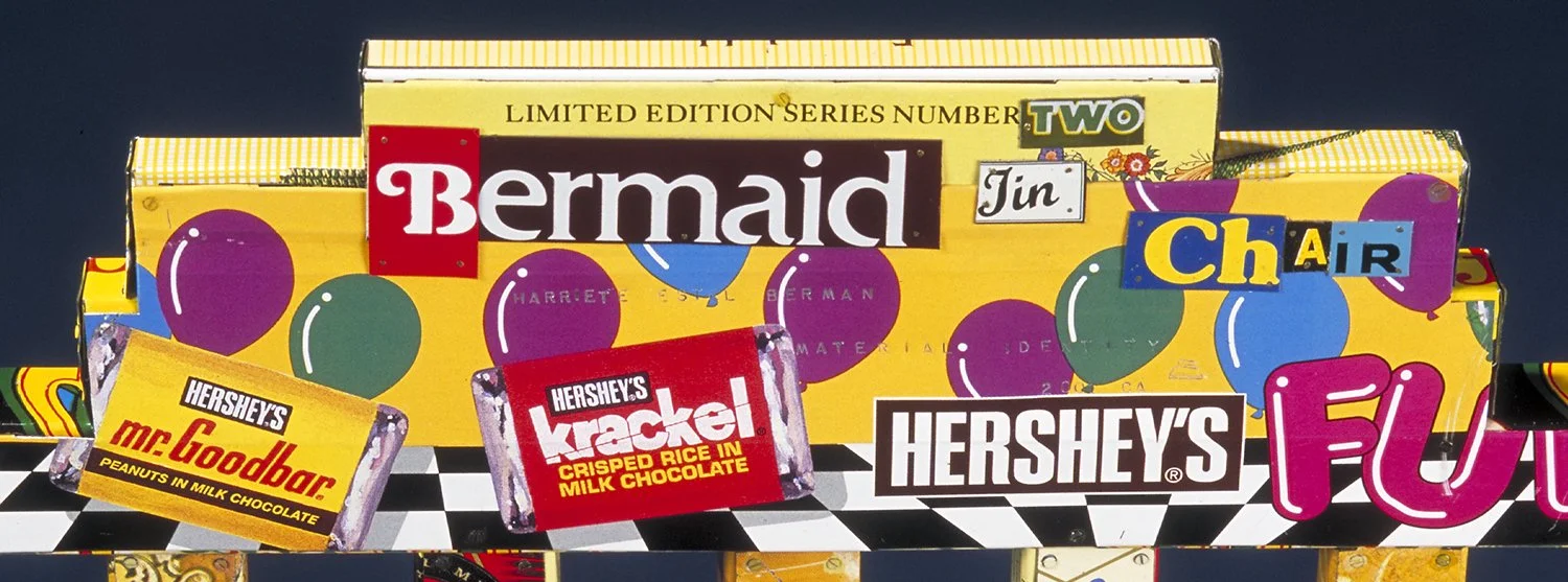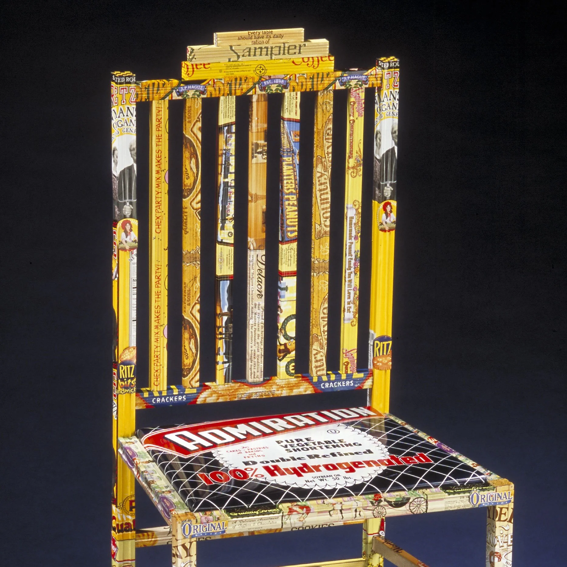 The close up image above of Material Identity Chair depicting desirable attributes like “original” and “quality” in pedestrian brand name products. A vintage tin for Mackintosh’s “Quality Street” Toffees and Chocolates goes around the edge of the seat cushion.