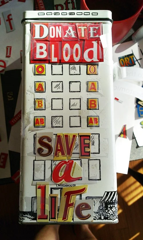 Taping on the lettering for the first version Donate Blood and Safe a Life.