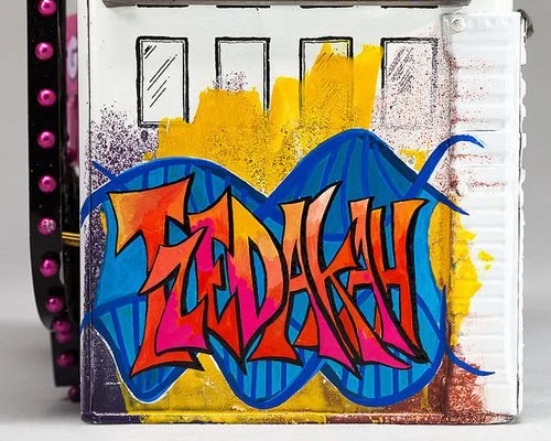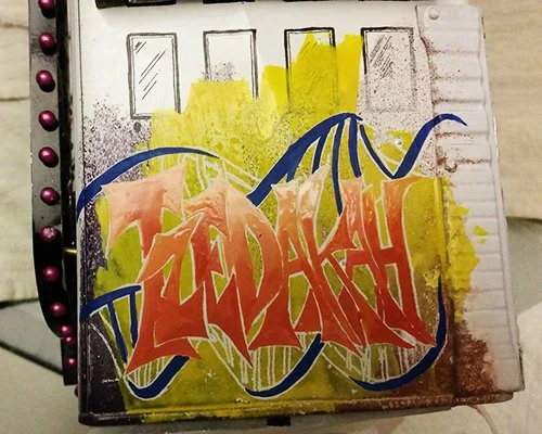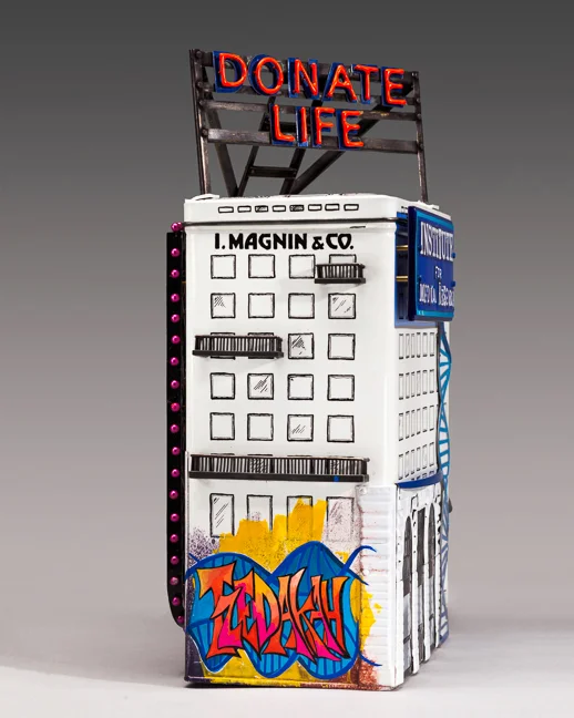 The tin has been repurposed as a tzedakah box. This is similar to how older buildings in San Francisco are renovated for a new purpose. The theme highlights contemporary forms of tzedakah such as participating in medical research, donating blood, and being an organ donor. Contributions that can “Donate Life.”