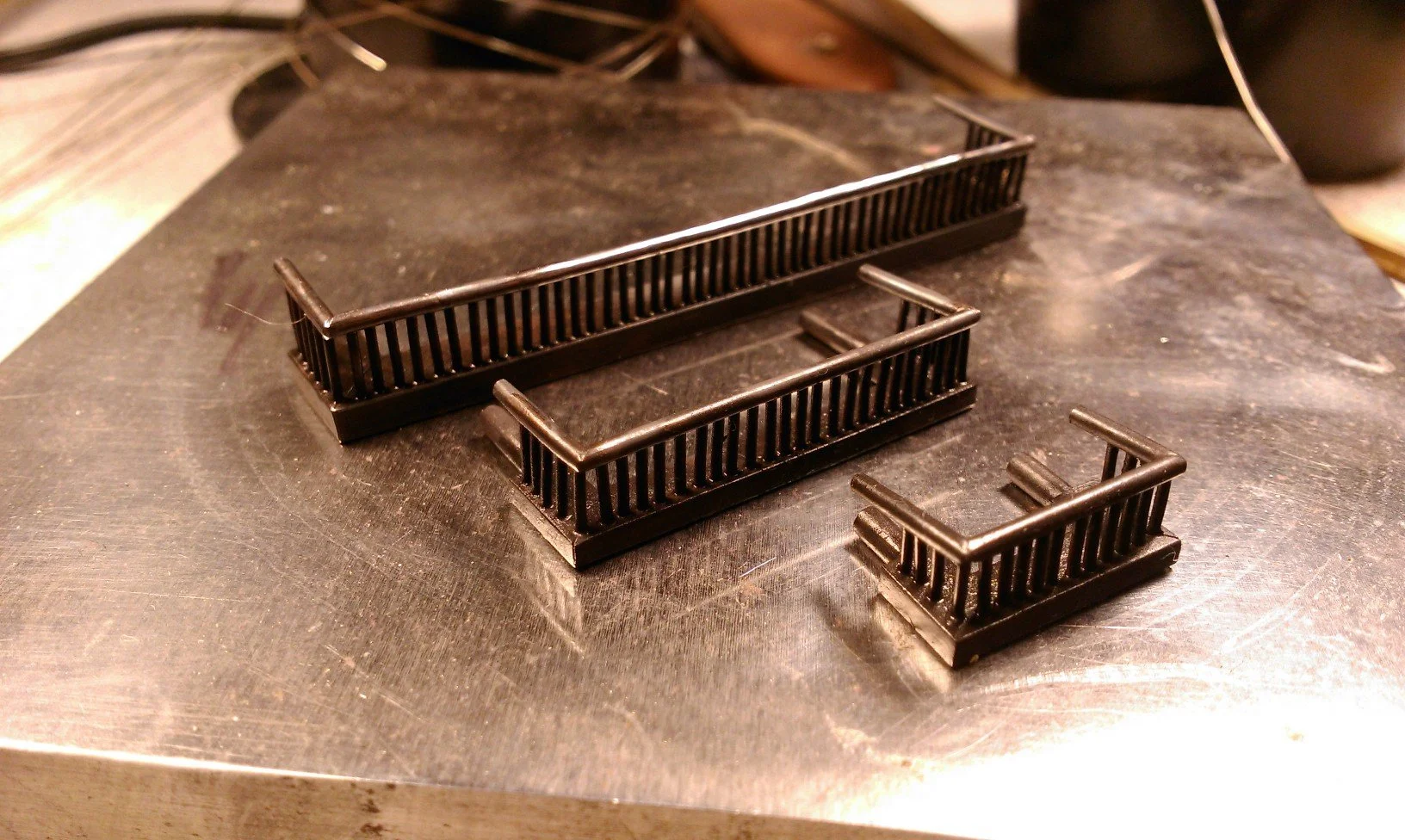 Close-up view of the faux building architecture. The black window panes were all cut out from black tin cans and placed on top of a metallic tin to give the impression of windows.