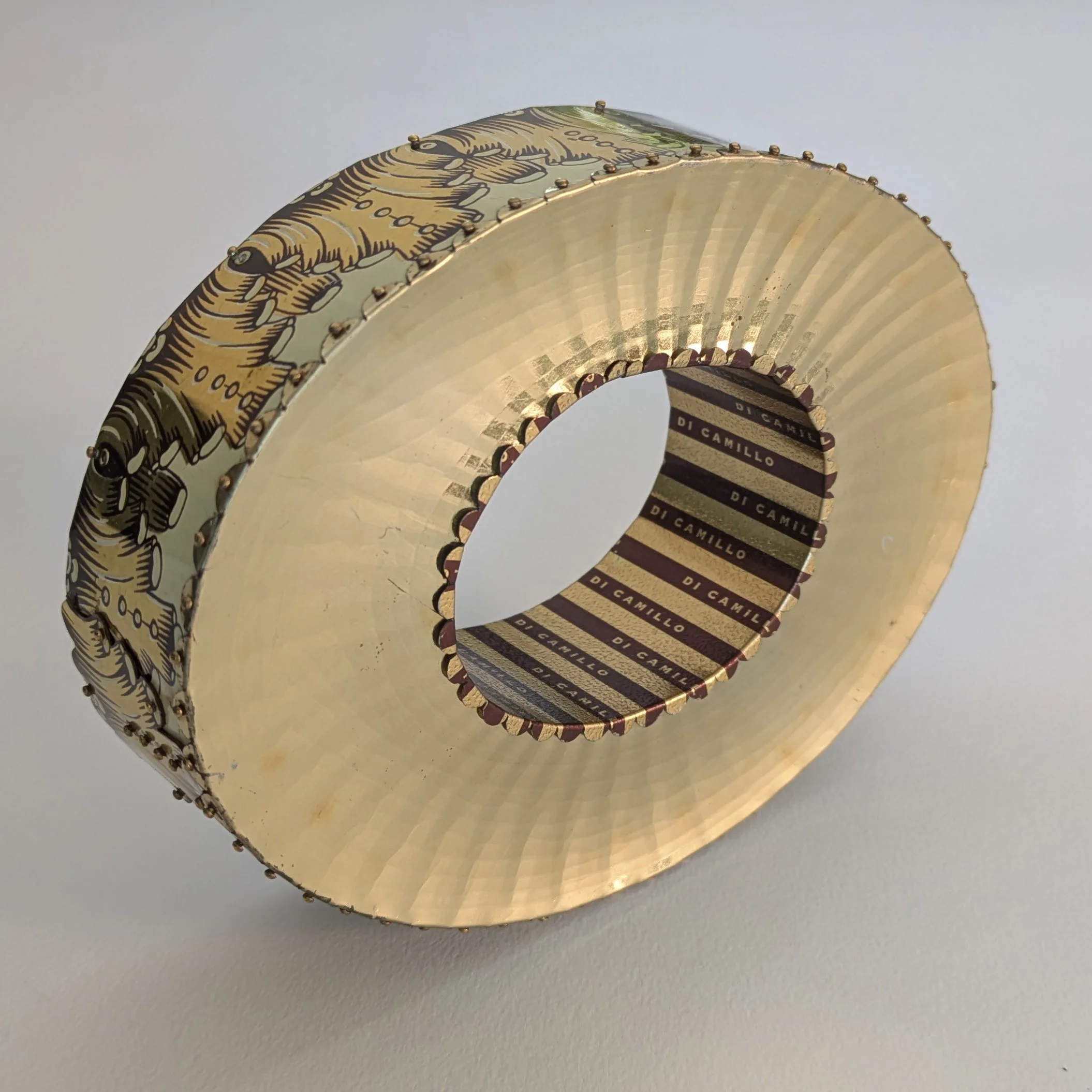 White House Oval Office Exposed Bracelet is from a new series of jewelry. This bracelet’s oval shape and ornate decoration is made entirely of recycled tin cans.