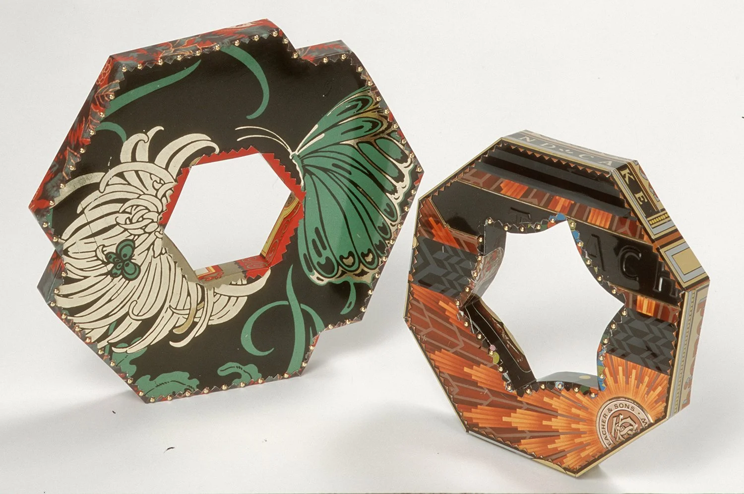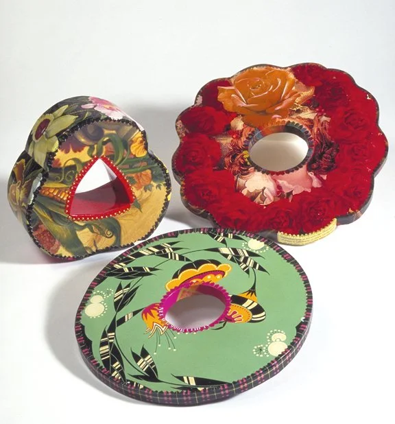 With a new series titled: Fool’s Gold Gilt Collection, I express my outrage and protest about the current, corrupt administration. The embossed surface echoes the Oval Office carpet. The elaborate construction is left open (left photo) to reveal the construction and metaphorically expose the truth. The walls of the Oval Office have become increasingly covered by gold gilt-on-guilt – apparently to distract attention from an exposed grifter, liar, misogynist, and racist seeking adulation and idolization. Trash about trash.