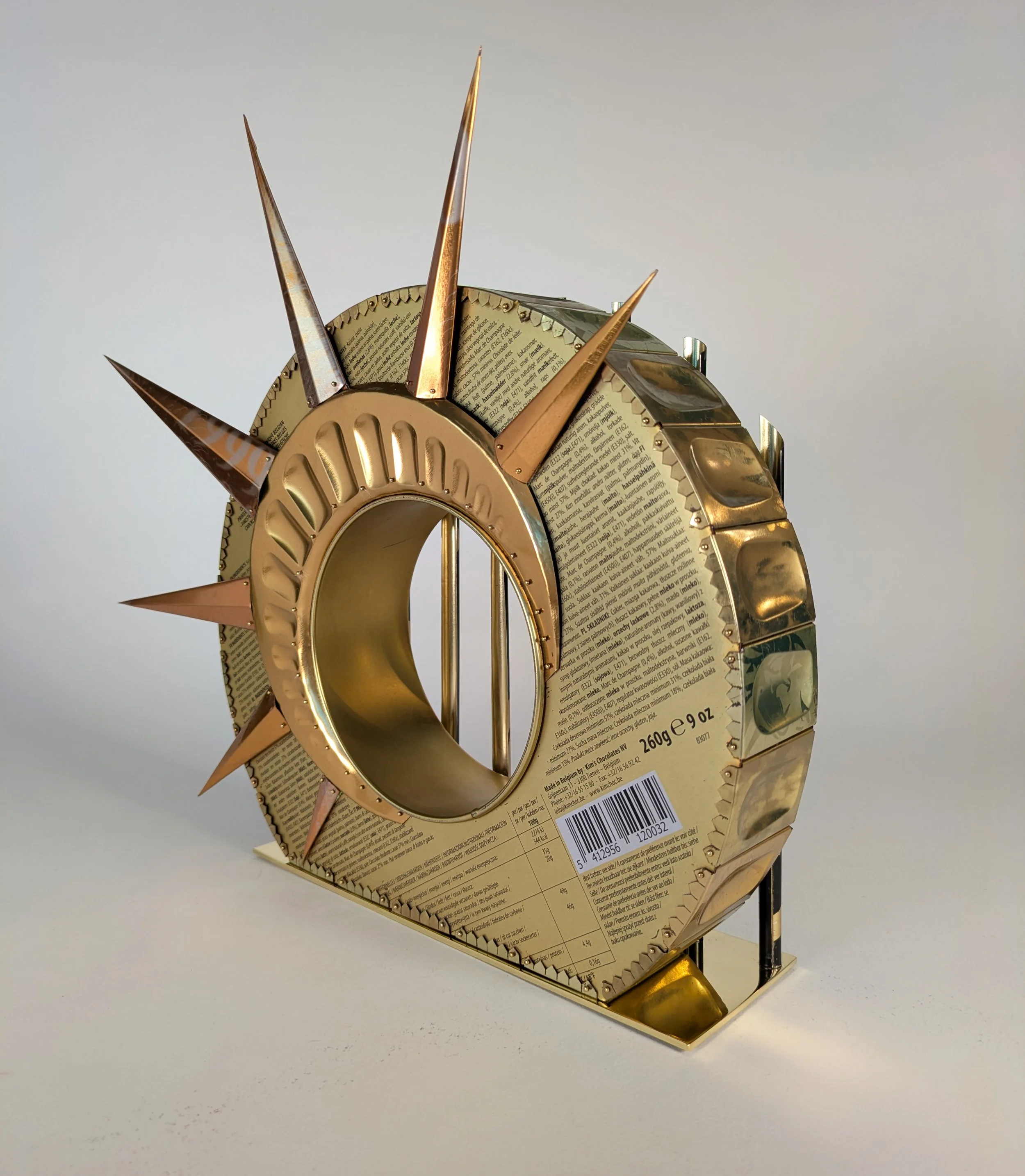 This bracelet is constructed with post-consumer tin cans. These humble materials have no intrinsic value, but the commentary in this jewelry reflects the hypocrisies of our time. The bracelets in the "Fool's Gold Collection" are carefully constructed with elaborate detail, but deliberately left open to metaphorically expose the ugly inner truth.
