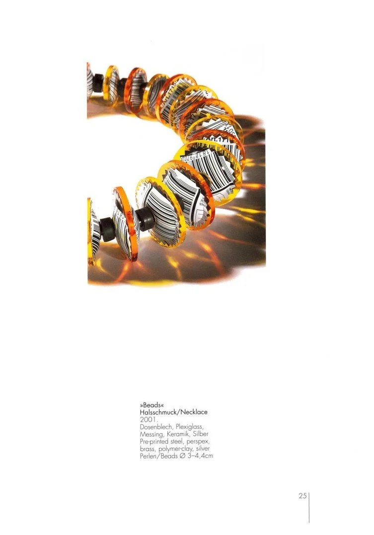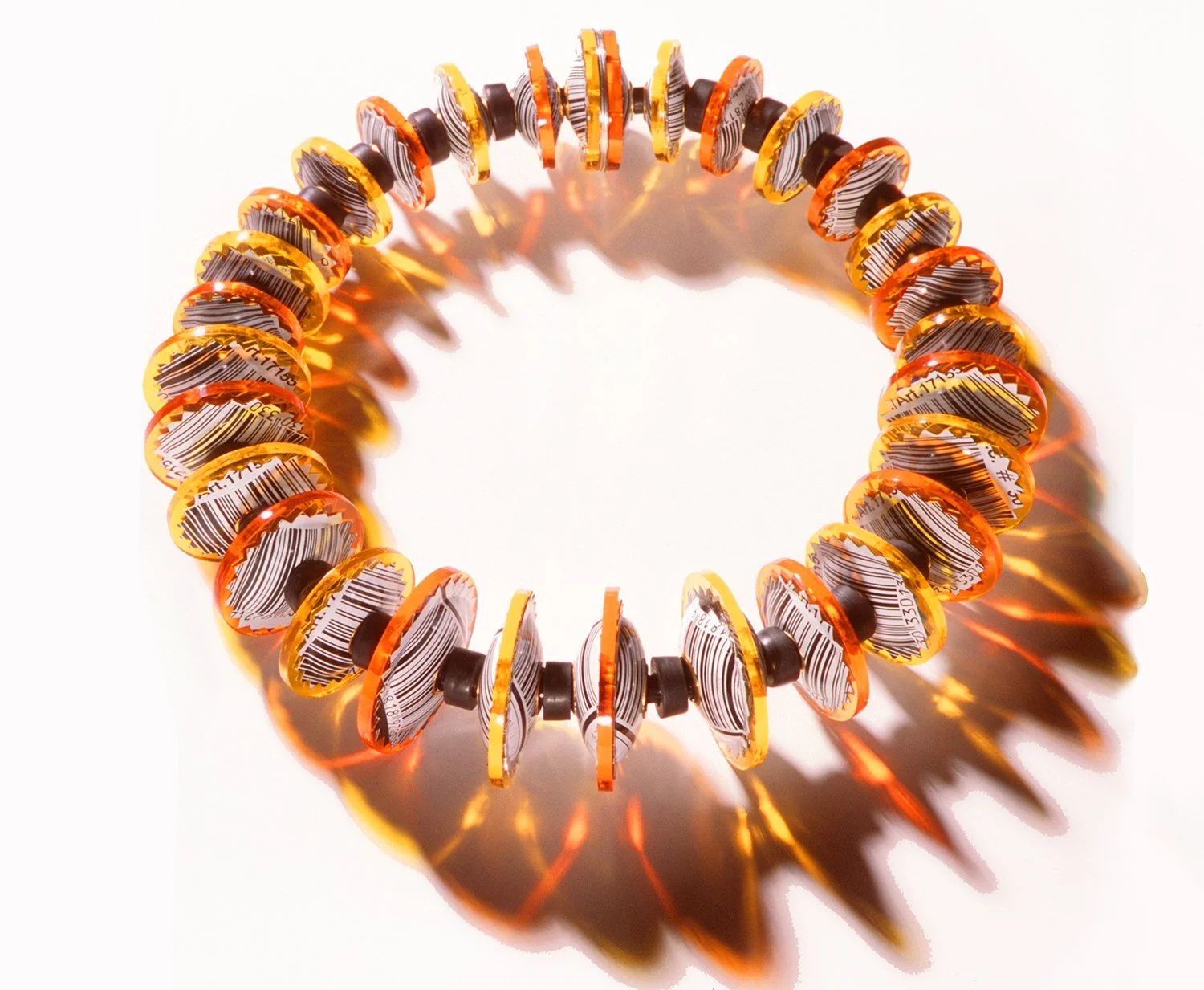Necklace of beads made from recycled UPC tin from post-consumer steel cans, Plexiglas center, brass tubing. polymer clay spacer beads, colored electrical wire cords.
