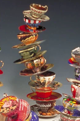 A concealed rod holds each stack of cups together in a precarious position. Not unlike our current economy which has been severly impacted by overspending and consuming without regard for realistic finances.